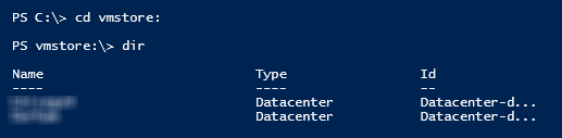 There are four special PSDrives from PowerCLI and the come in pairs: vi:/vis:, vmstore:/vmstores:. Note the colon on the end, it is part of the PSDrive name, not a delimiter. The singular version of each are for the last VIServer connected to; the plural version is for all connected VIServers. ‘vi/vis’ will show contents of each host, such a the VMs currently on it. The one we care about is ‘vmstore/vmstores’ which is where the datastore contents are. As we are restricted to a single VMhost or vCenter server, use ‘vmstore:’ You can manipulate each PSDrive with normal cd and dir commands. Cd into vmstore: and run dir and you will see your datacenters: