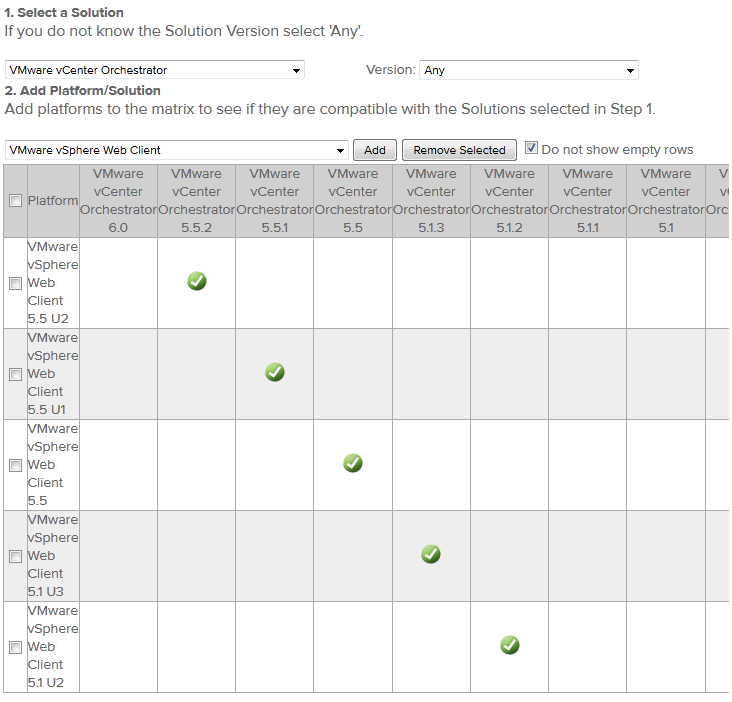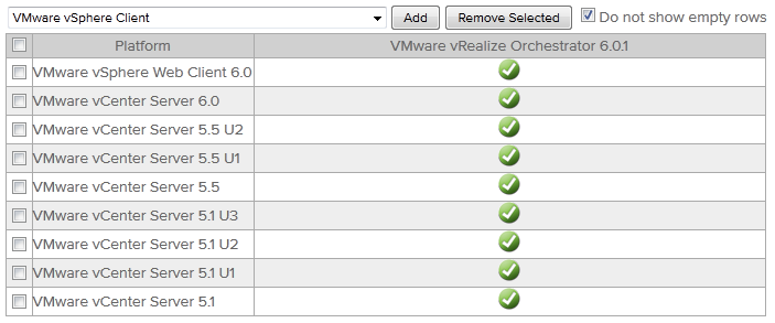 I recently asked on twitter if the latest version of VMware’s Orchestrator, vRealize Orchestrator 6.0.1, would work with vCenter 5.5. I have not upgraded my hosts or vCenter to version 6 yet, but I wanted to save a step of having to upgrade vCenter Orchestrator to vRealize Orchestrator later if at all possible. I was directed to the VMware Product Interoperability Matrix. I selected VMware vRealize Orchestrator (Management Products), version 6.0.1 in step 1 and VMware vCenter Server (vCenter Server) and added it in step 2.