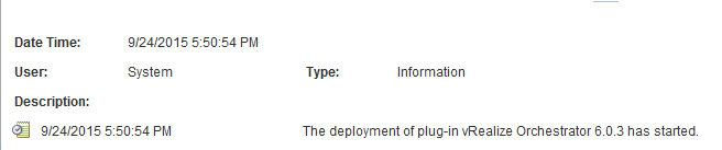 The last thing I had to figure out was how to get the Web Client plugin working. After registering, I still didn’t see the vRO server listed in the vRO plugin. Log into the Web Client as administrator@vsphere.local and navigate to Administration > Solutions > Client Plug-Ins. Click the Check for New Plug-Ins button. You’ll be directed to the Events tab. You should see an event indicating the plug-in deployment has started. Refresh in few minutes and you should see the completion event