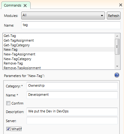 C:\> New-Tag -Category Ownership -Name Development -Description "We put the Dev in DevOps" -WhatIf