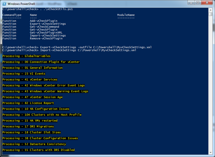 Finally, we need to save our settings. vCheckUtils.ps1 comes to the rescue again with the *-vCheckSettings functions. Export-vCheckSettings creates a CSV file with our settings and Import-vChecksettings imports them. It’s important to note that the Import util will struggle if our CSV file doesn’t have settings for an enabled plugin, so we want to keep this with our disabled plugins script and run that first. You will also notice I used PowerShell in this screenshot, not PowerShell ISE, because the functions use some color tags that aren’t present in ISE – hopefully this will be fixed soon.