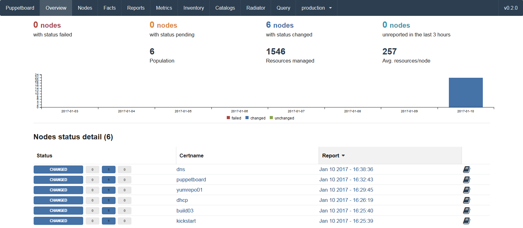 You may remember that I said I had close to 15 nodes earlier. There’s only 6 reporting. This is why I wanted to set up puppetboard! Now I can review my VMs and get them all reporting, then look for failed nodes in here on a regular basis and fix things when they happen, not months later. I hope this helps you, as well!