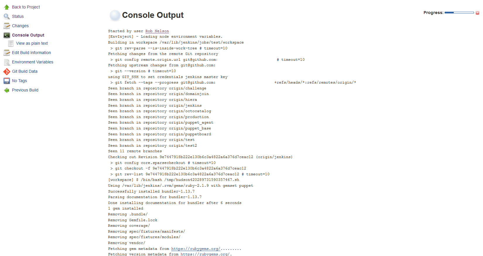 You can see git running to check out the last revision that was made to the controlrepo (automated builds will be based off the specific change that is seen from GitHub) followed by the activities of the bash script. Hopefully, this looks like you running your rspec tests locally, with a few weird ASCII color codes embedded in it, followed by Finished: SUCCESS. Hurrah! Of course, if your commit failed, you’d see Finished: FAILURE – but still a “success” from the viewpoint of our build actually completing.