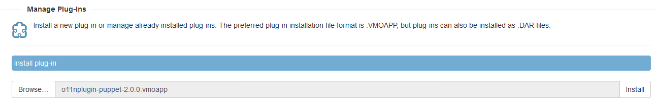 First, download the plugin. You’ll need a SolutionsExchange login to acquire it. Next, visit the vRO Control Center (URL: https://vro.example.com:8283/vco-controlcenter) and select Manage Plugins near the bottom. Click Browse… at the top, point it to the downloaded plugin, and click Install. Follow the prompts to restart the vRO instance. If you have any vRO Clients open, you MUST close them and re-open them after the restart, as the plugin adds new Types that are not loaded dynamically. You’ll just get weird errors when working with Puppet workflows until you re-launch the client.