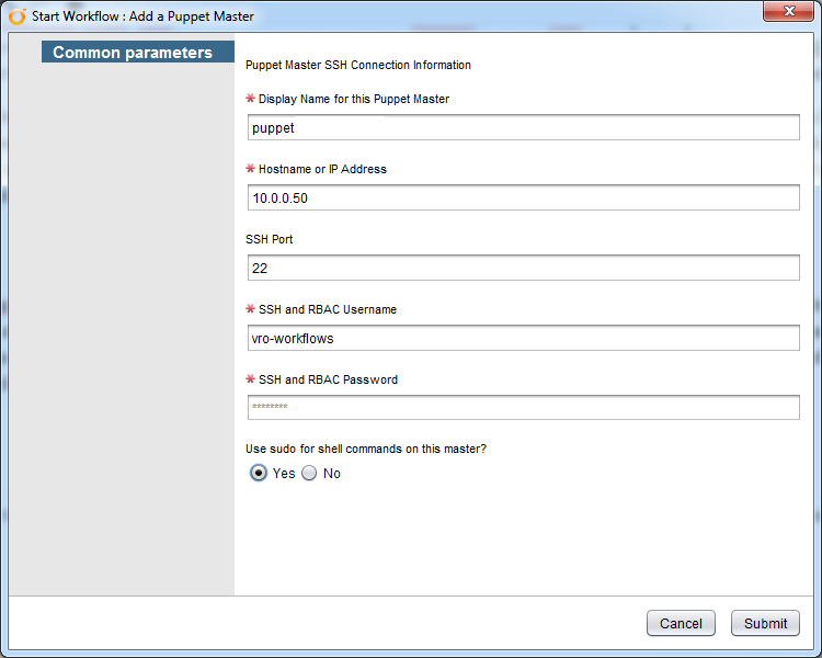 This means we need a non-privileged user and to enable sudo. I’ve chosen the username vro-workflows, but any will do. We need to add a single sudoers stanza for this user as well, vro-workflows ALL=NOPASSWD: /opt/puppetlabs/bin/puppet, /opt/puppetlabs/bin/facter, /bin/cp, /bin/kill. We can do this via puppet, of course. I use saz/sudo and added this sudo_conf hash via hiera to my puppet master. Make sure this config is applied before proceeding.