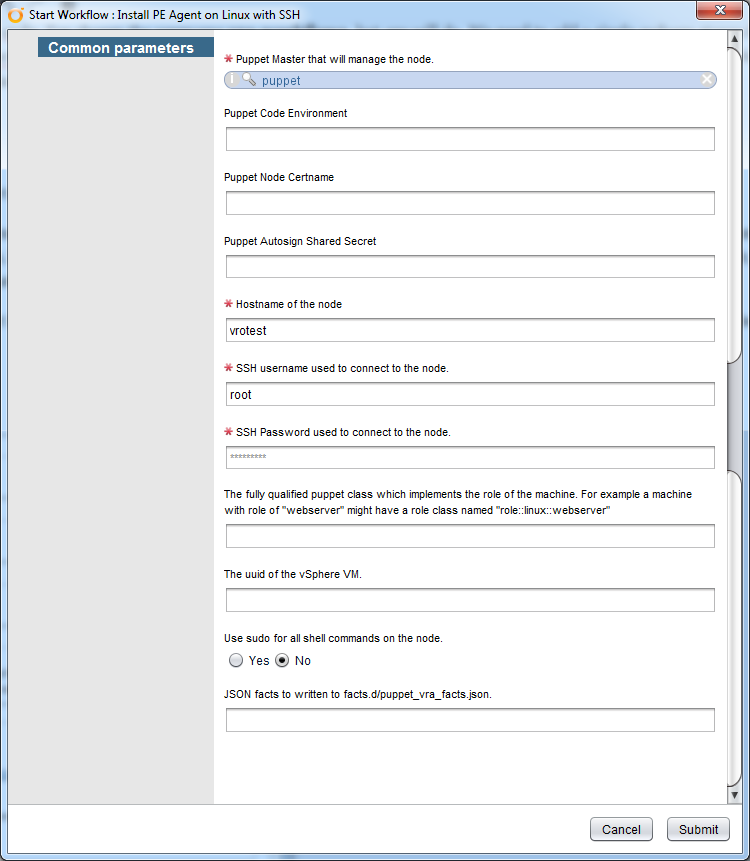 You can certainly provide the other fields if you need them. Do NOT select sudo if the user on the agent (not the master!) does not require sudo as that will generate errors. In the lab, I use autosigning by domain, but ideally using a shared secret here is more secure and something I will be looking at soon. Environment, certname, and role all come from my existing puppet classification, but could be useful if I need to override something. The JSON facts are great when I want to provide some custom fact during deployment, like datacenter=midwest that would help puppet classify the new node properly. I’m not sure why I’d want to use the uuid when I have the hostname, though, that one has me baffled.