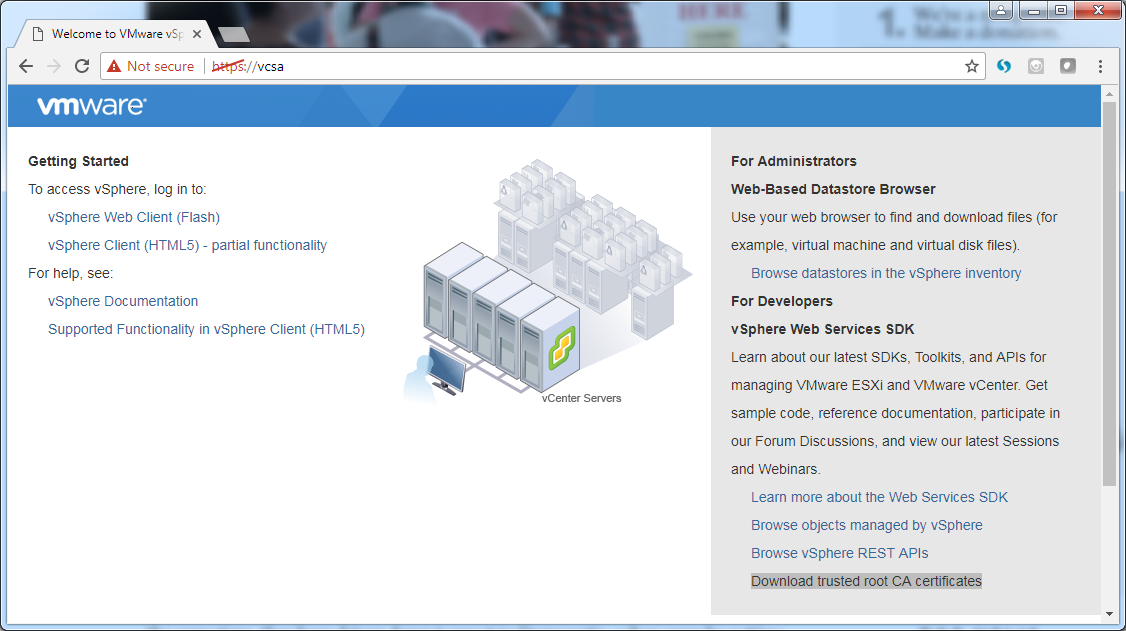 The first step to trusting the vCenter’s included CA is to download the certificate bundle. You can do this by visiting your vCenter on port 443, e.g. https://vcenter.example.com, and clicking on Download trusted root CA certificates: