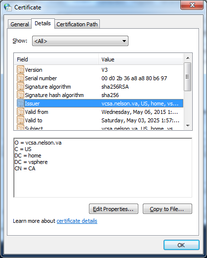 Click the Import button and browse to the CRT you stored earlier. When you import it, you’ll see the name CA – if you see ssoserver, you chose the wrong CRT file, try again with the other. You can now click on the imported CA called CA and click View to see the name. This is important when you have more than one vCenter, as they all import with the name CA, because that’s not confusing! You can see here this is the CA from my vCenter server called vcsa.nelson.va: