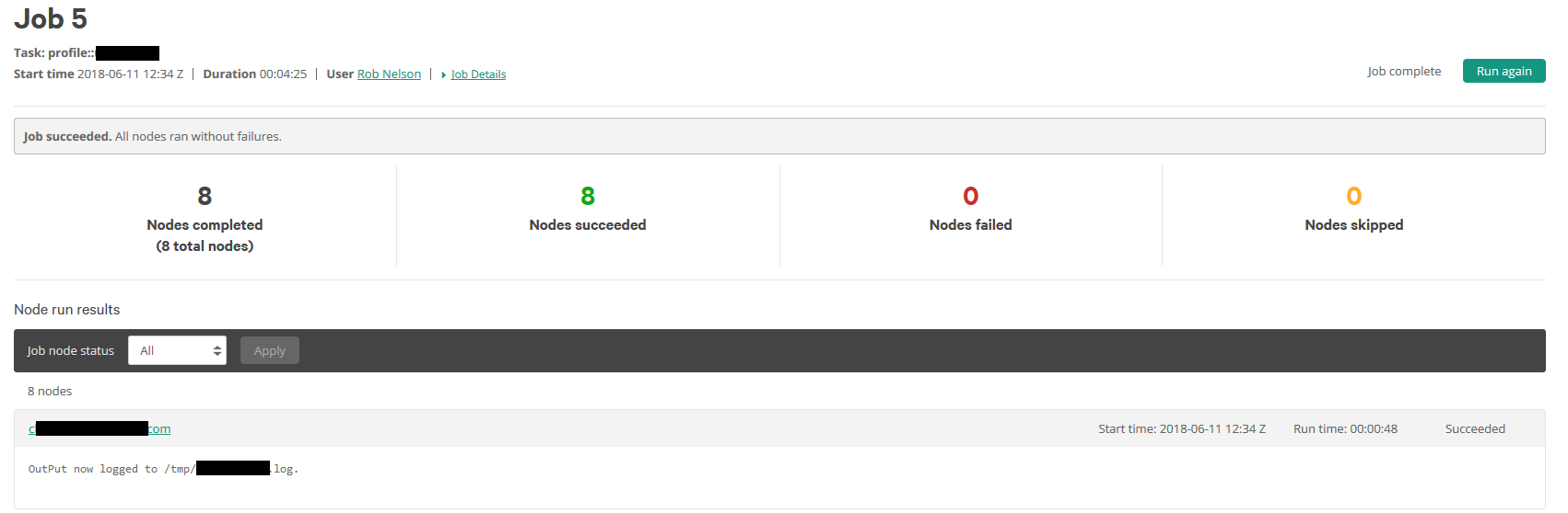Click the Run Job button and you’ll be sent to the Inspect -> Jobs page with your new job selected. The page will update as the job runs and show you any output on stdout/stderr that you did not redirect: