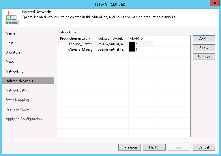Do not just change the VLAN ID and click OK! Take a look at the Isolated Network. I know it’s difficult to see with my scrubbed image, but it’s the same name as the previous isolated network. Click OK and the VLAN ID of both isolated networks are the same. An edit to either will update the ID for both. This isn’t what we want. The isolated network name needs changed. We can make it match the default format of <virtual lab name> <Production network name> or just <Production network name> or just enter free text like Bob. It doesn’t matter what it is called as long as it’s unique. Now, I cannot explain why the wizard doesn’t automatically change the name of the isolated network, but it doesn’t, so we have to do that ourselves. Big tip of the hat to Jason Ross who described the issue and fix in the Veeam forums. Once the Isolated Network is renamed, and click OK and the mapping will look something like this:
